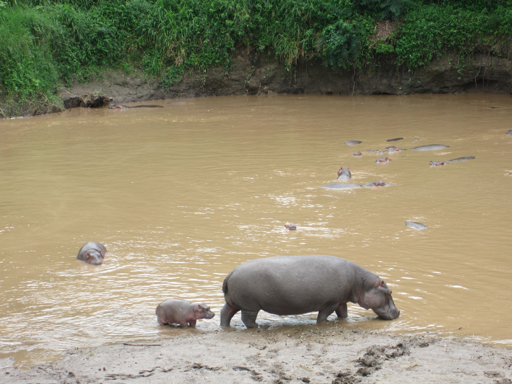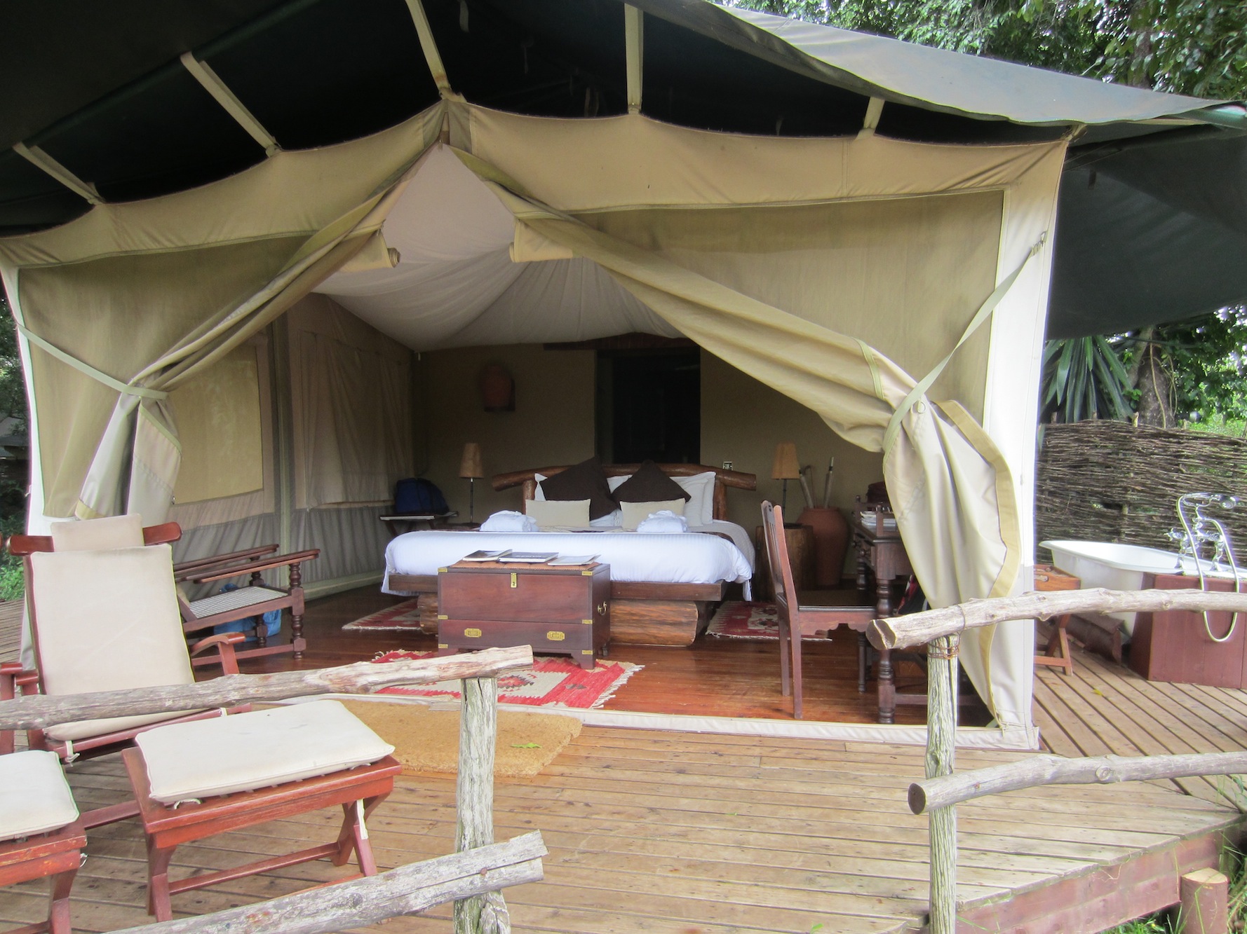 We arrive at Explorer and are checking in on the open air reception area where there are bright yellow “black headed weaver” birds fluttering in the tree where they have built many many onion shaped nests; below is our first hippo sighting expelling air from just below the surface of the muddy brown Talek River. We follow a beautiful stone path to our luxurious #4 tent – the farthest tent out where our friend Harmon Hooterite Parker had, in years past, built the solid wood floor. There is a porcelain tub on the deck outside the tent, colorful African woven rugs on the floor and a long wooden vanity. There are hippos snorting and bellowing in the river right outside the tent. I text Teri :” Yeah. I’m not coming back.”