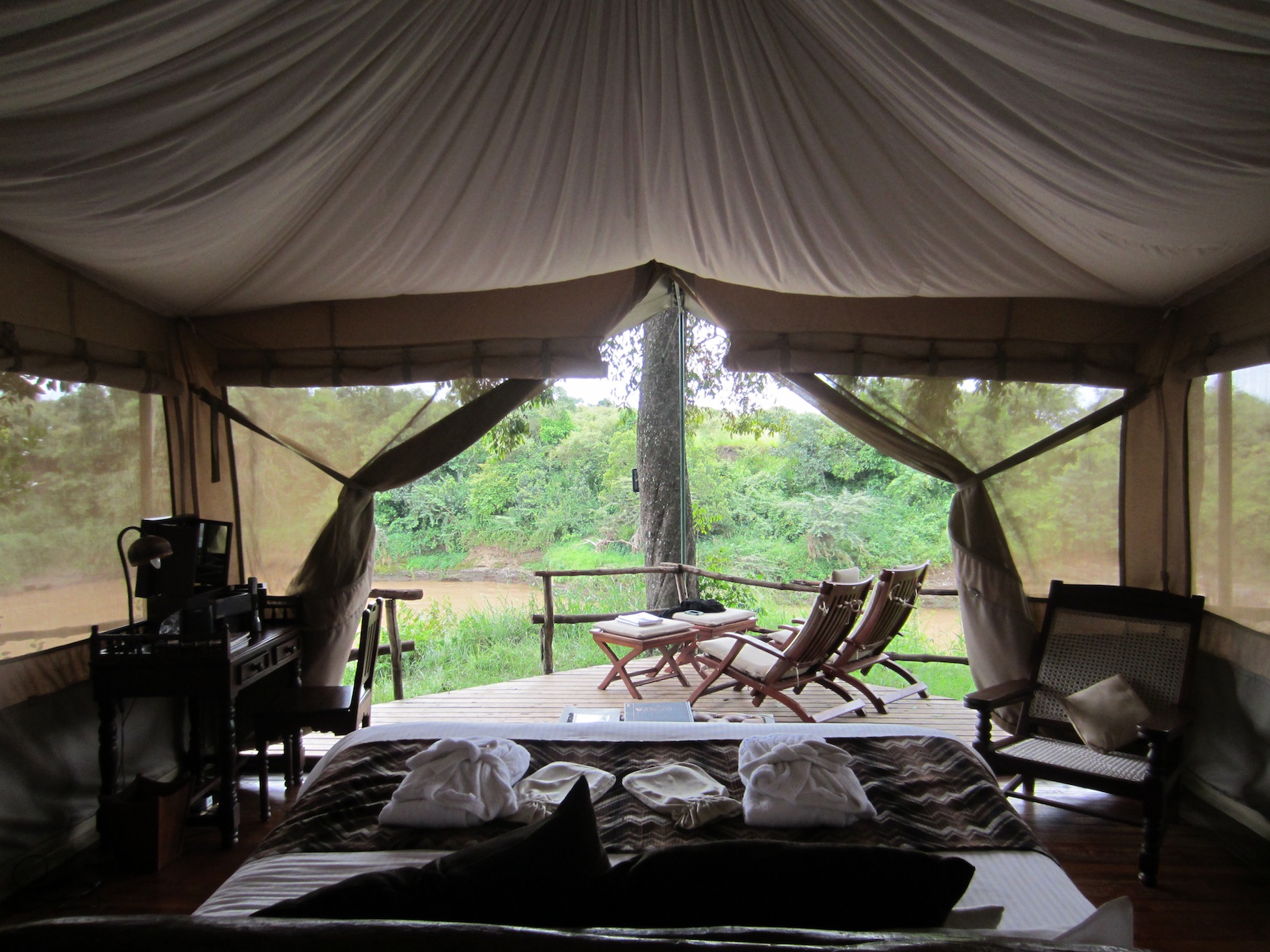 We help ourselves to our luggage from the bin below the passenger cabin and are escorted to the land rover for the 5 minute drive to the wonderful Mara Explorer camp. As we are driving, we see three necky female giraffes and we stop to gawk.