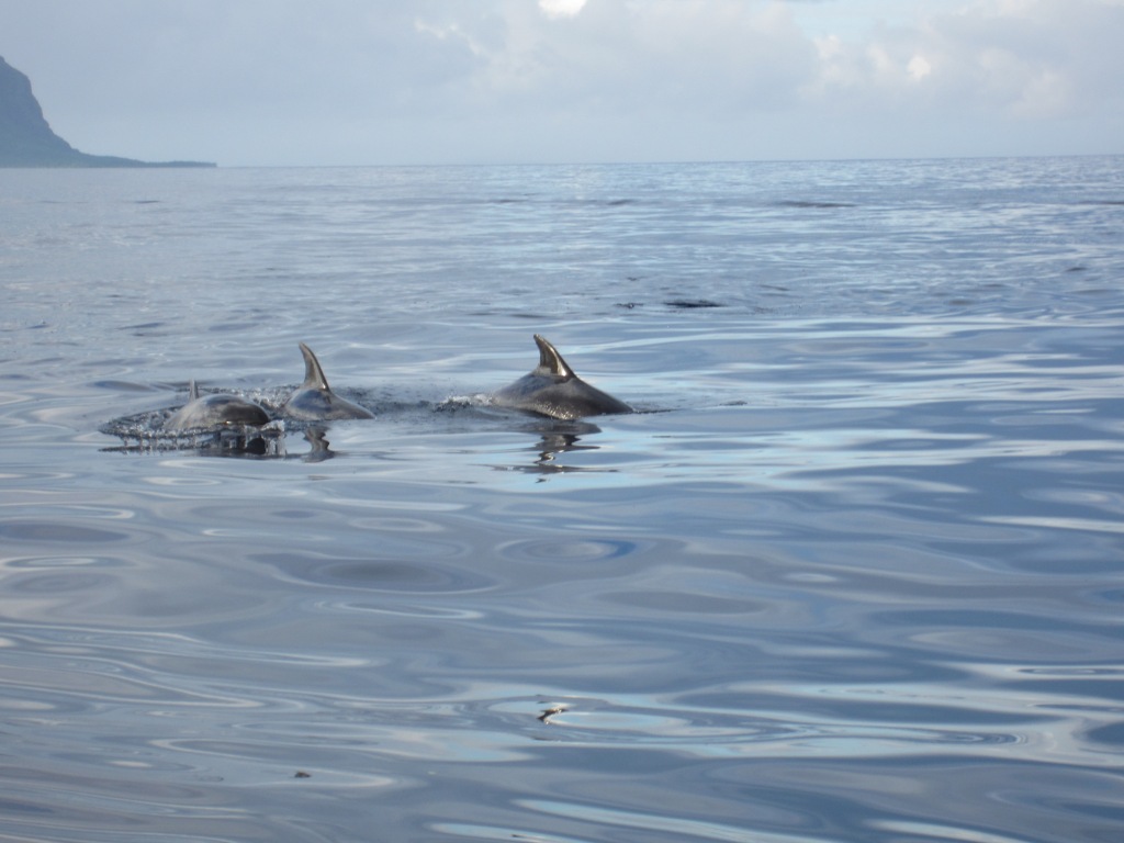 With two days remaining on Mauritius, we spontaneously decide to book a small boat to go interact with the dolphins. At 5:30 am on our final full day we meet Skipper Fred who is tan and pretty buff (do NOT picture the skipper from Gulligan’s Island) J. He motors us through the light rain out of the Tamarin Bay scanning the water all around. It takes about an hour – a scenic hour where we see the mist rising out of the mountains on land, a brilliant rainbow, and some fabulous flying fish (fascinating!). We come into a pod of bottlenose dolphins along with a few other boats; we slip in and out of the water with our fins and masks to experience these amazing and, I think, gentle creatures Of course we do not touch them – I hope we are keeping a respectful distance – but we are close enough to get a good look and it is exhilarating!