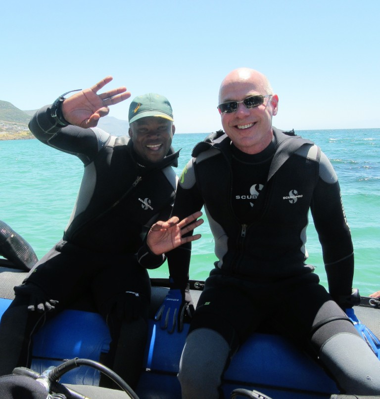 Our group of nine wet suit clad scuba divers walk along the road a short distance in the hot sun toward the beach where the Zodiac (a rigid inflatable boat) is waiting in the shallow water. Our captain Graham helps us in and we speed over the waves of False Bay toward our first dive. I can feel myself tensing as we slam through the choppy water (thankfully, there are straps on the floor to slide at least one foot in to prevent us from being thrown into the sea) and I remind myself to stop resisting, breathe, relax, and experience the moment.