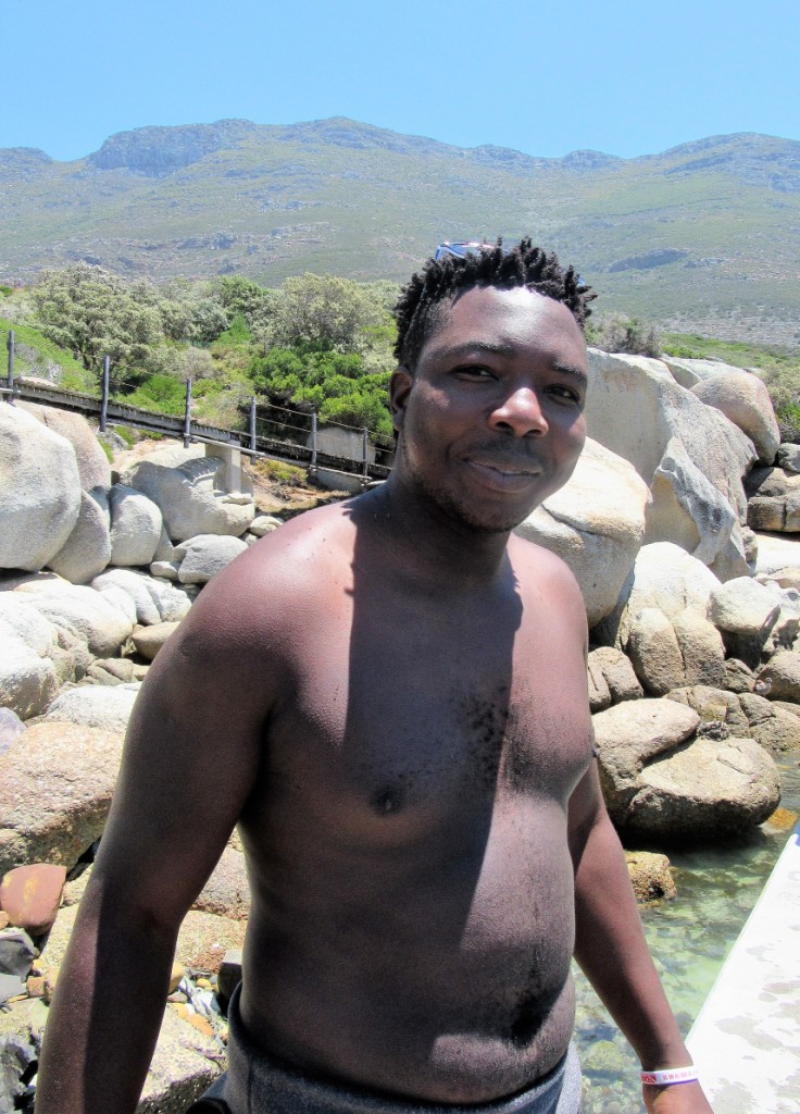 Finally we get back into the boat and are heading toward the second dive. I’ve already told Chris to not even THINK about trying to talk me into getting back in (in my mind, I will never dive again). Almos says, “Chris, Sherrie will be your buddy “ (Sherrie is an Australian PhD student studying marine biology – specifically sharks – who also helps me get my shit together as we approach the second dive); “come on, Beth, you will be my buddy!” Next thing I know I have a full tank on my back and I am flipping back into the water again! We descend this time using the sturdy kelp to pull ourselves lower, and I am holding on tightly to Almos’ hand (I never let him go until our ascent – although I eventually loosen up). We are told to be as still as we can because we are trying to see sharks; they will not approach if there is a lot of flailing going on. Almos and I lead, gently pushing the kelp stalks and their brownish slippery leaves to clear our path; he frequently checks in with me and I give him the a-okay signal. The water is cold and not as clear as the tropical waters I have been in. Suddenly, Almos squeezes my hand and points. I see a dark mass coming toward us and there – right there – directly face to face – is a massive Cow Shark. I hold still, look, breathe and he gracefully and non-aggressively glides away. This shark has smooth light grey skin, a protruding but blunt nose and small eyes; the sharks we encountered were about 10 feet in length. We see many Cow Sharks as well as the Puffadder Shy Shark who hides in the crevices between the rocks and also a Leopard Cat Shark (these two varieties are quite small). We see bright orange Red Roman Fish, schools of blue-ish silvery Strepie Fish, yellowy-orange starfish, and colorful sea urchins as we make our way through the kelp forest. Our dive lasts about 40 minutes and by the end of it, the cold is giving us leg cramps.