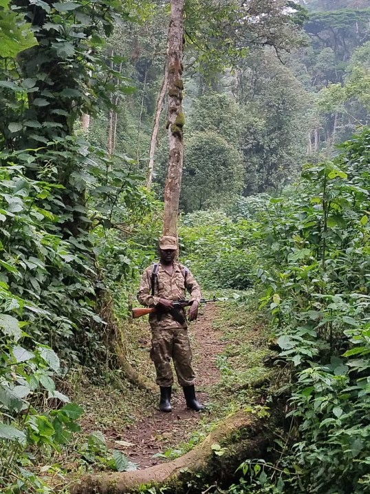 We meet the rest of our trekking group. Steven is the ranger who gives us a short briefing about the trek itself and the gorilla family we will be visiting – Mishaya Gorilla Group. He explains that in order to safely allow human visitation, some of the fewer than 800 remaining gorillas in the world have been habituated – they have slowly been exposed to humans and have been deemed comfortable enough with our presence so as not to feel threatened and therefore become aggressive. Benson is our able porter who (thankfully) carries our backpack full of rain ponchos, bug spray, our lunch, and lots of water. Two trackers will precede us to locate our gorillas and communicate with Steven to guide us to the gorillas. Bringing up the rear is a UPDF (Uganda People’s Defence Force) soldier armed with an AK-47 in case we encounter poachers…err, I mean elephants (either one is dangerous and conceivably will be scared off by a shot into the air).