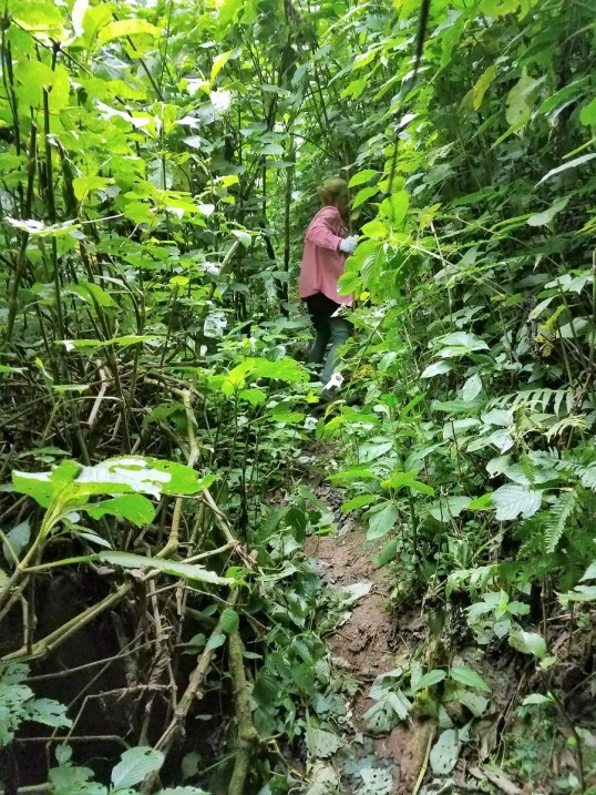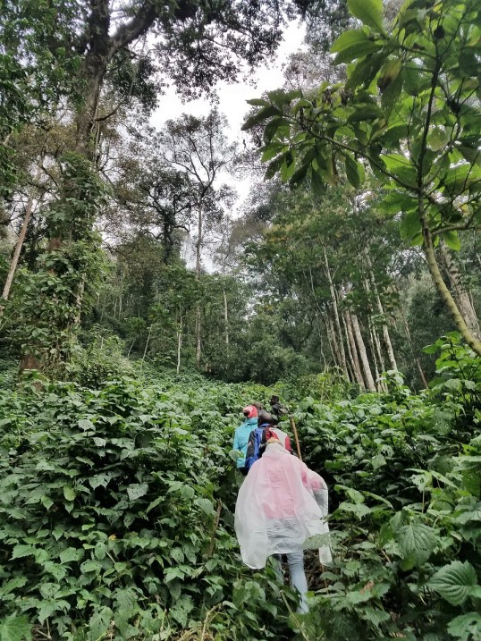 Eventually we stop so Steven can get an update from the trackers; “they have found the gorillas, but they are still moving. We will take a “shortcut” (those are MY air quotes!) to try and intercept them. We should be there within an hour”. After trekking a total of 3 ½ hours, Steven tells us to leave our walking sticks and backpacks with our porters. We have reached the gorillas!