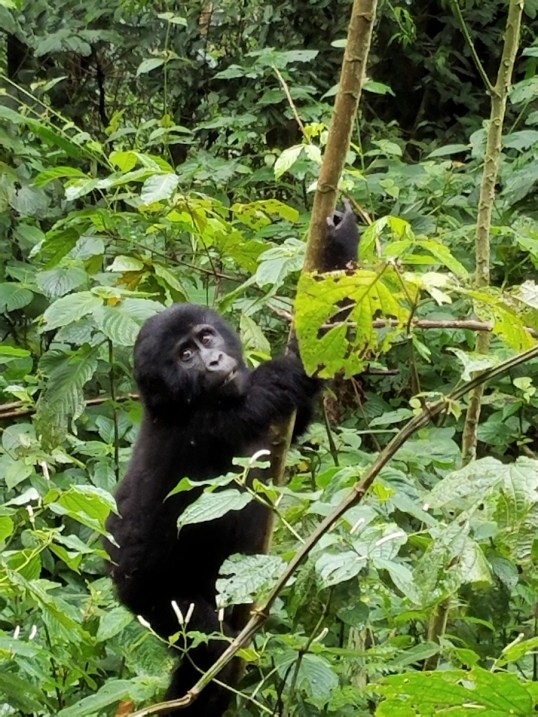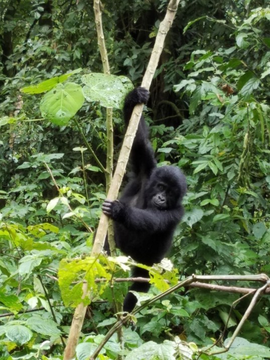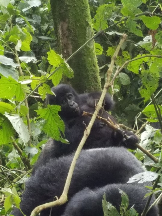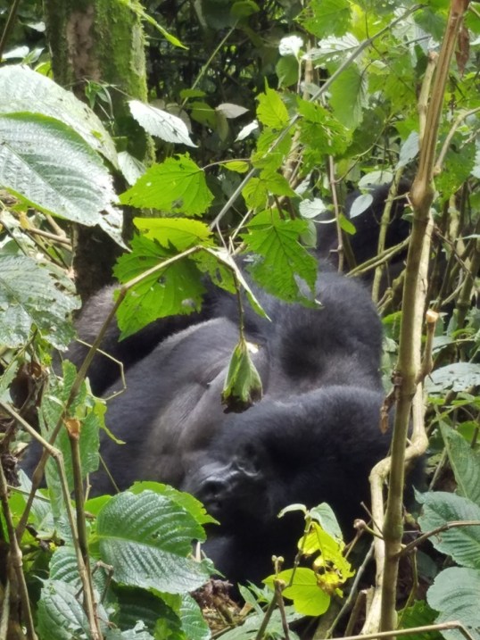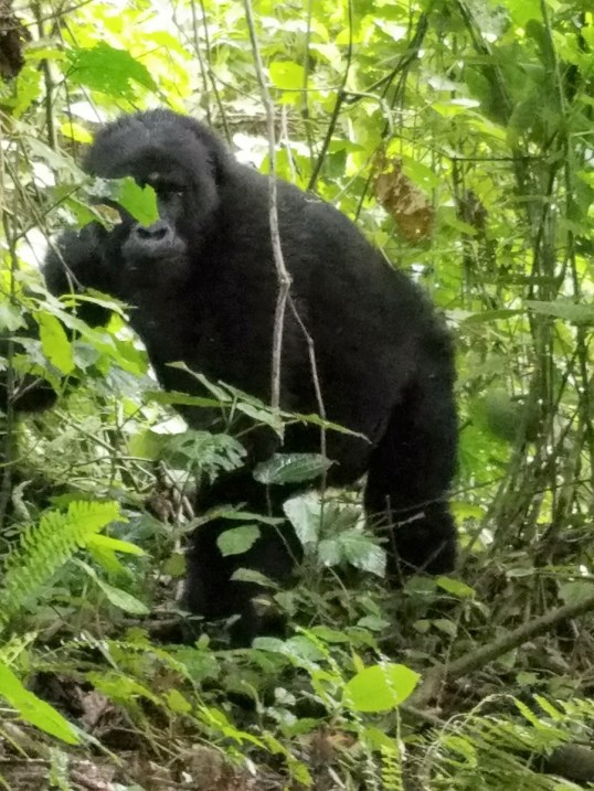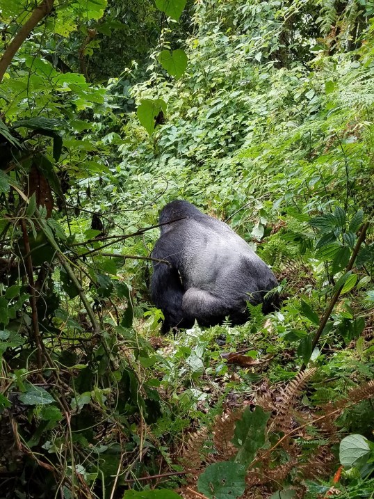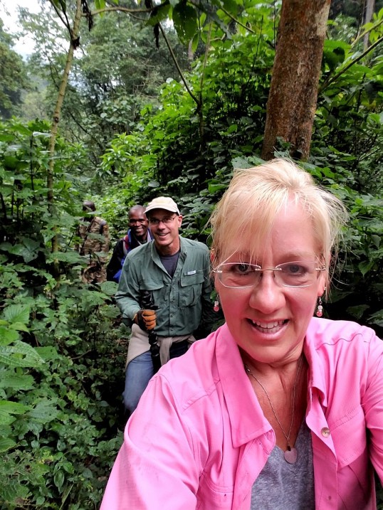 It is before sunrise as we set off from the scenic Nkuringo Bwindi Gorilla Lodge for the hour drive to the Rushaga Gate of Bwindi Impenetrable Forest in Uganda. Our goal is to find the critically endangered mountain gorillas. We are traveling on an unpaved and (according to Google Maps) an “unknown road”. This is not an uncommon occurrence for us; these are the roads where you see the real countryside – it is rough, it is raw, mountainous, and breathtakingly beautiful. Chris and I converse with the other woman in our trekking group, Kat, who is a chatty young Australian mother living in Kigale, Rwanda. The hour goes by quickly.