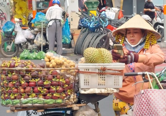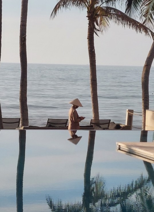 The iconic bamboo conical hats (“non la” in Vietnamese) are seen everywhere. In the brilliantly verdant rice paddies, surrounded by “moats” of water, white plastic bags rustle and wave in the breeze like white flags of surrender, serving as makeshift scarecrows. Meanwhile, the occasional white egret extends his long narrow neck above the plants to spy his next meal. Among this scene, there is almost always at least one non la, worn by both men and women, poking up through the lime green sodden field; it is a protective cover from the blazing sun and the soaking rain. In cities, the non la is part of the Vietnamese “costume”, worn authentically by locals and in-the-moment poser tourists.