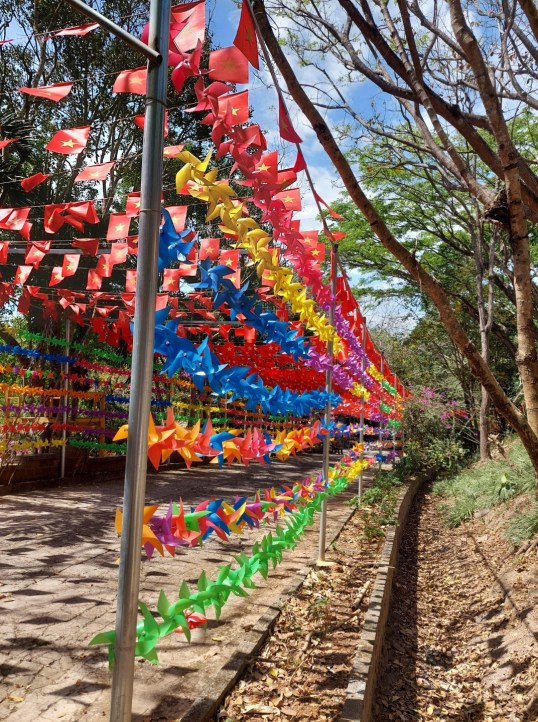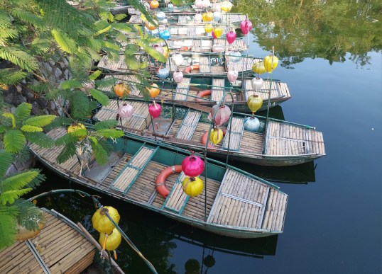 At first, the litter was disconcerting, but you eventually get used to it and look beyond to find the beauty. Often, I find the beauty in the trees and hanging from wires above – in the kaleidoscope of lanterns, flags, and even pinwheels. There are even lantern boats!