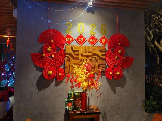 Back to red….it is the color of Tet – the Lunar New Year celebration that goes on and on and on! Red decorations, red clothes, red flowers, red everything! This holiday, to the Vietnamese people, is very important. It signifies looking forward to a fresh start, forgiveness, spending time with family, fireworks, and relaxing away from work. The holiday, to a tourist, is a bit of a logistical nightmare (personally, I don’t recommend traveling in Vietnam during Tet). Things become more expensive and harder to find. We had trouble finding restaurants open, acquiring water, or finding a massage! Almost everything was shuttered. The sign on the 24/7 convenience store read “closed for Tet”. Huh?? We did scooty-doots around and found beer and cafes open – for coffee. 2026, Year of the Fire Horse; although we respect the holiday and the traditions, it was a big pain in the butt.