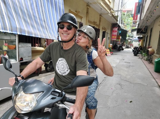 It makes sense that the Vietnamese people travel around town on motorbikes. It is economical and there are hordes of motorbikes everywhere! Most other tourists we met weren’t brave enough to rent motorbikes, but not my Honeybuns! I was always on the back, trying to lean WITH him, navigating, and helping him look out for the crazy drivers (without exaggeration, pretty much all of the drivers here are crazy). It is ridiculous driving in most of Vietnam. Most intersections have no traffic signs or lights; it’s just a free-for-all with everyone beeping their horns to let others know they are coming through. Its like a game of chicken in a culture where “me first” is a next level sentiment! People drive their motorbikes, thumb hovering over the horn, going the wrong way up the street, making left turns from the far right lane, darting between vehicles, amassing between idling cars and the traffic light (when there IS a light), dipping, weaving, and cutting in front of anyone even if the other was a lot bigger. Stressful, to say the least, but we got the hang of it and I think the divots in Chris’ hips from my knees gripping him have started to disappear by now! Even as a pedestrian, you must be hyper-vigilant. Motorbikes are parked on the sidewalks, forcing pedestrians to walk in the street. Crossing the street is also really challenging, you must wait for a slight break in traffic, plunge in, hold your hand out, and go. While we’ve seen several small accidents among motorbikes, we’ve not seen any involving people on foot.