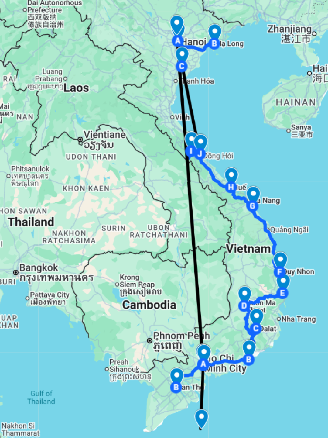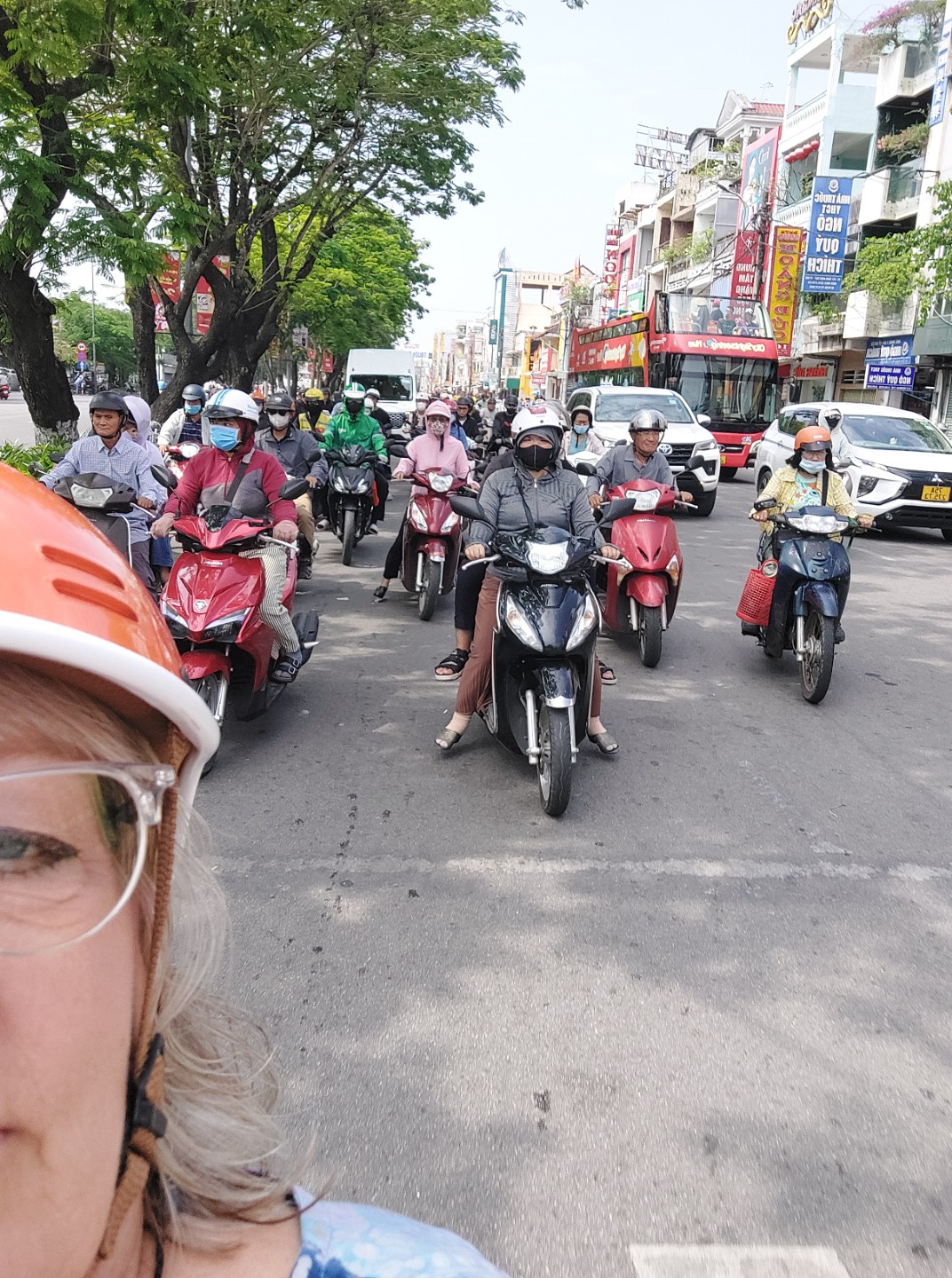 It makes sense that the Vietnamese people travel around town on motorbikes. It is economical and there are hordes of motorbikes everywhere! Most other tourists we met weren’t brave enough to rent motorbikes, but not my Honeybuns! I was always on the back, trying to lean WITH him, navigating, and helping him look out for the crazy drivers (without exaggeration, pretty much all of the drivers here are crazy). It is ridiculous driving in most of Vietnam. Most intersections have no traffic signs or lights; it’s just a free-for-all with everyone beeping their horns to let others know they are coming through. Its like a game of chicken in a culture where “me first” is a next level sentiment! People drive their motorbikes, thumb hovering over the horn, going the wrong way up the street, making left turns from the far right lane, darting between vehicles, amassing between idling cars and the traffic light (when there IS a light), dipping, weaving, and cutting in front of anyone even if the other was a lot bigger. Stressful, to say the least, but we got the hang of it and I think the divots in Chris’ hips from my knees gripping him have started to disappear by now! Even as a pedestrian, you must be hyper-vigilant. Motorbikes are parked on the sidewalks, forcing pedestrians to walk in the street. Crossing the street is also really challenging, you must wait for a slight break in traffic, plunge in, hold your hand out, and go. While we’ve seen several small accidents among motorbikes, we’ve not seen any involving people on foot.