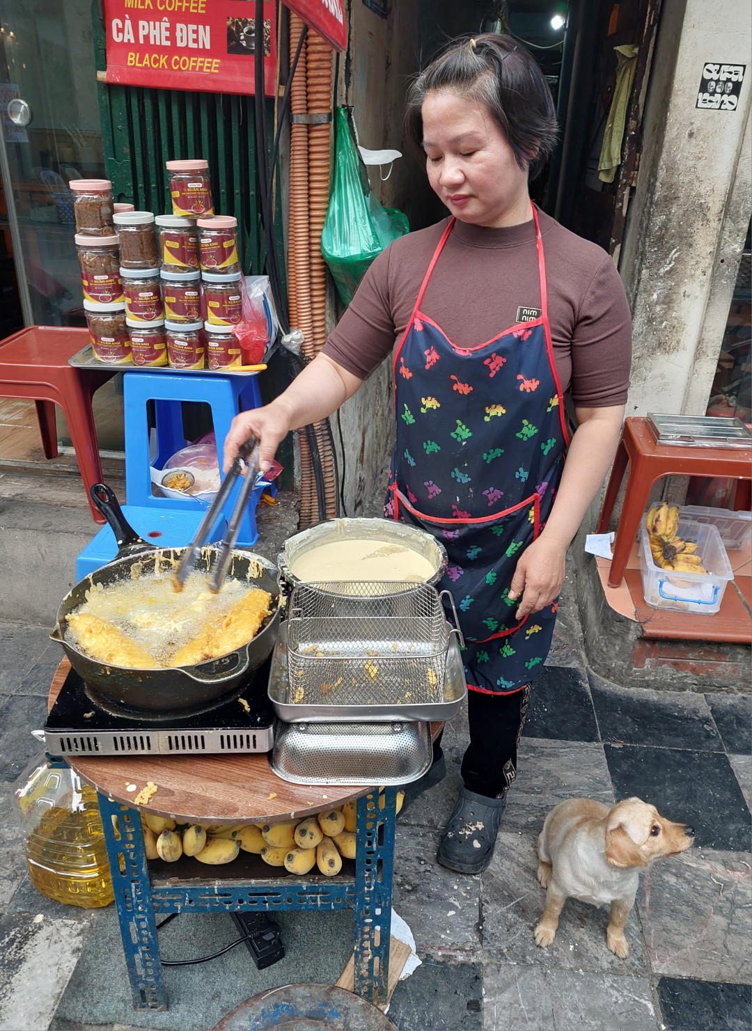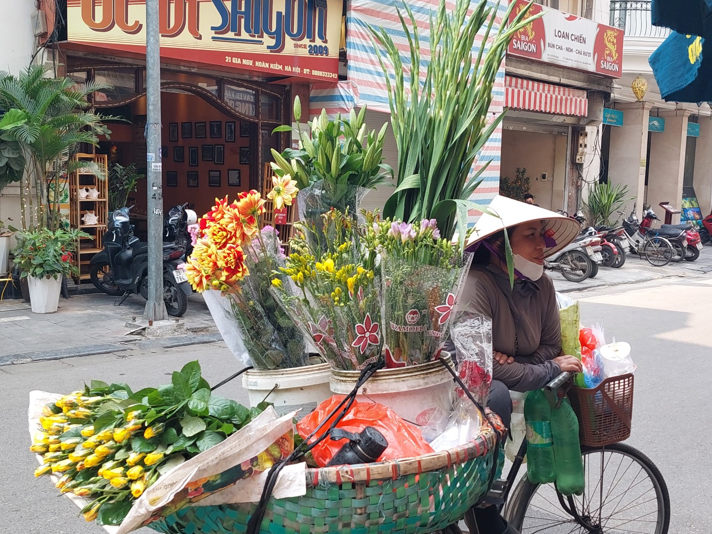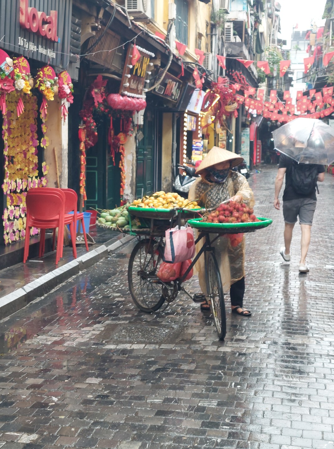 The iconic bamboo conical hats (“non la” in Vietnamese) are seen everywhere. In the brilliantly verdant rice paddies, surrounded by “moats” of water, white plastic bags rustle and wave in the breeze like white flags of surrender, serving as makeshift scarecrows. Meanwhile, the occasional white egret extends his long narrow neck above the plants to spy his next meal. Among this scene, there is almost always at least one non la, worn by both men and women, poking up through the lime green sodden field; it is a protective cover from the blazing sun and the soaking rain. In cities, the non la is part of the Vietnamese “costume”, worn authentically by locals and in-the-moment poser tourists.