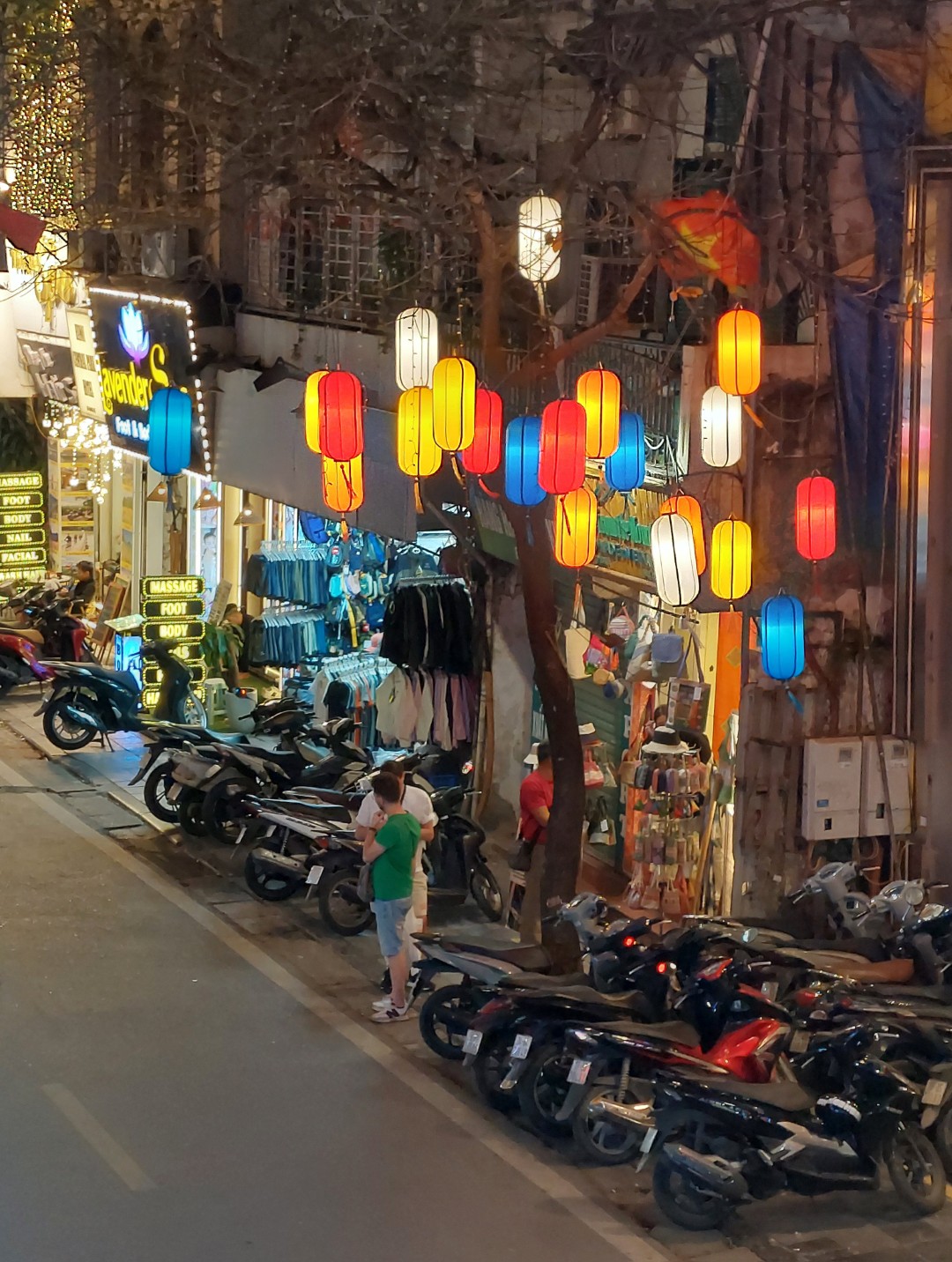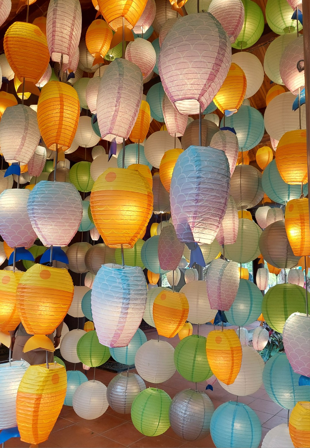 At first, the litter was disconcerting, but you eventually get used to it and look beyond to find the beauty. Often, I find the beauty in the trees and hanging from wires above – in the kaleidoscope of lanterns, flags, and even pinwheels. There are even lantern boats!