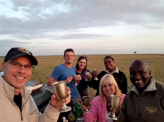 During the six plus weeks we are here, we again experience the sights, sounds, smells of being in the Mara. The animals patterns are different because of the season, as well as the abundant rains which have caused the plains to be wet and green in the beginning of the project. There are large herds of elephants, females with their calves or sometimes the lone bull, looking for love – we see, and sometimes hear them close to the camp as well as each time we drive for supplies, on airstrip pickups, or on rescue missions (lorries that need to be pushed/pulled out of the mud). There are always many twitchy wide-eyed gazelles, Wildebeest are non-existent (they are still in Tanzania) until the end of the six weeks when we spot a small few, and zebras are not as close-by or plentiful. We are constantly aware of the lumbering, guffawing hippos in the river below us, and become keenly respectful of how quick (and “un-lumbering”) they really are after Chris gets charged by one who is cornered on the deck of one of the tents (Chris came sprinting up the path to our tent, dove in, and when he eventually caught his breath told me “I saw death!” – this all after I was warned not to come out of the tent…); that’s one scary-assed animal. We also encounter the beautiful and regal lions many times as they look and blink, sit with their front paws curled under, yawn, and scan the landscape around them as the cubs romp; there are also the lion noises we hear from our tent most nights that give away their proximity. There are short-legged hyenas, gawky giraffes, awkward ostriches, sly silvery monogamous jackals, cheeky vervet monkeys, an enormous troop of raucous baboons, the sleepy scaly crocodile. Rounding all of this out, we cannot forget to mention the blood-sucking mosquitoes, stinging tsetse flies, scampering bugs, and snakes (I may have seen a black mamba and a spitting cobra). To be honest, none of this will ever get stale for me (well, maybe I don’t need the bug and snake encounters…). The Kenyan bush is magnificent!