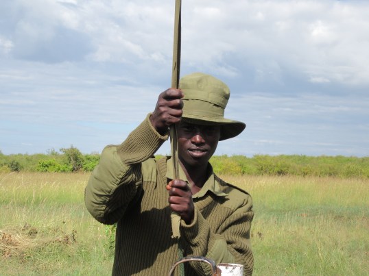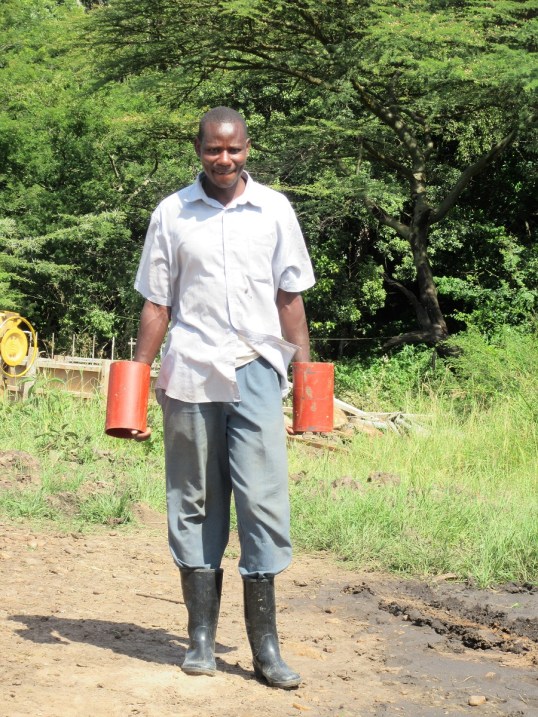 This is Lepapa, our inventory control guy. He loves that he uses one of the walkie talkies to keep communication among the teams at both bridges; he takes his job very seriously and is, indeed, very good at it. He runs equipment back and forth and does manual labor. He is the liaison between the wzungu and the non-English speaking guys – letting me know when someone has a backache, wants to go into town for a haircut, or needs to see family. Lepapa reports to us when there is a family or individual crisis with one of the team (and there are several of these situations throughout the six weeks). Lepapa walks about 2 hours (one way) to go to his family and after one of these visits, brings Chris and me beaded bracelets his wife has made for us. He openly teaches me about Maasai customs and traditions. He loves his wife and is supporting her to finish one last exam (that she missed because of the birth of their second son) in order to become a nurse.